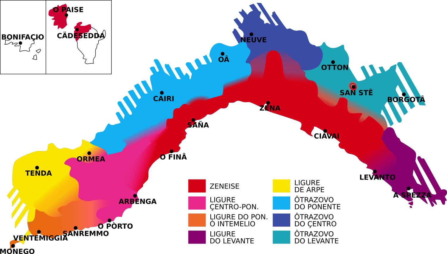 Pe «ligure» s’intende l’insemme di parlæ da Liguria, compreiso e forme locale do Prinçipato de Monego e de communitæ tabarchiñe inte isoe da Sardegna.